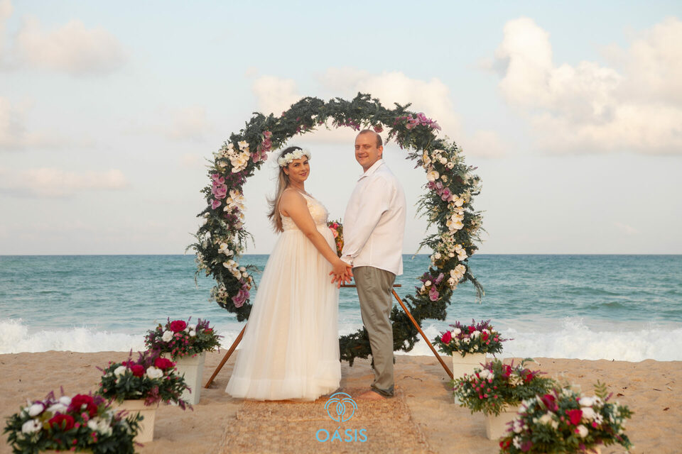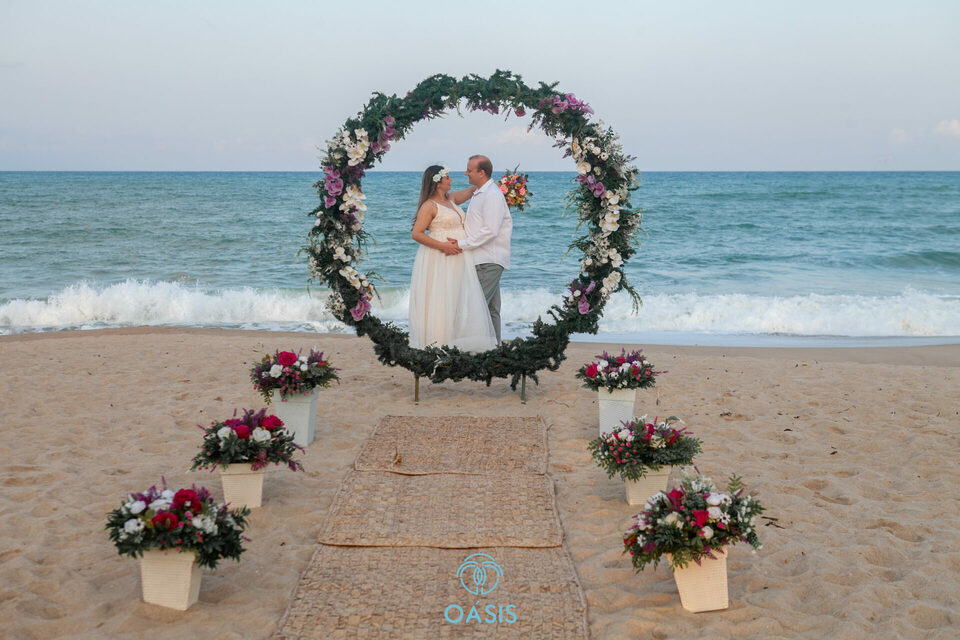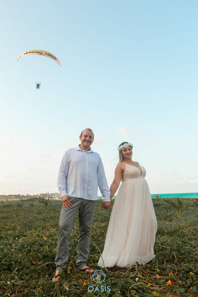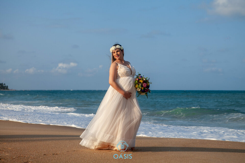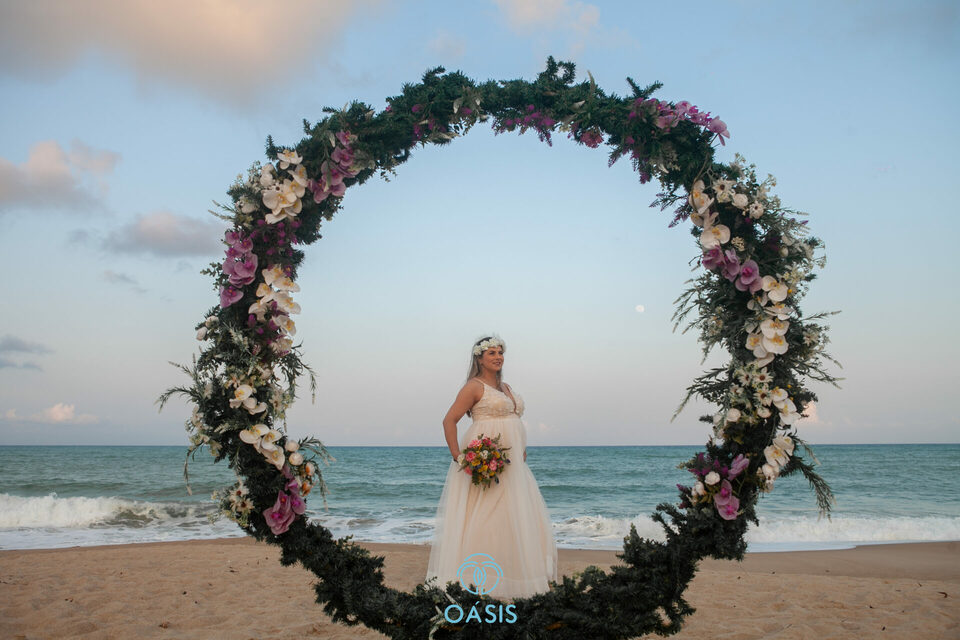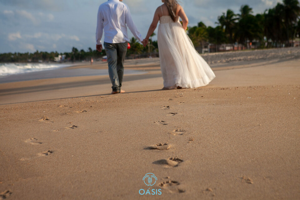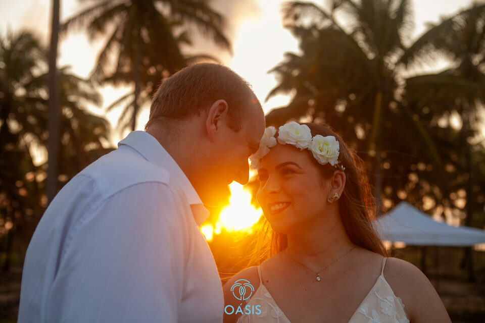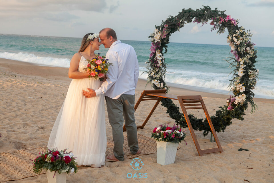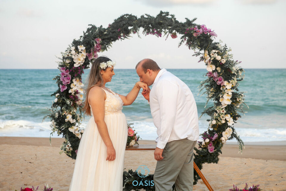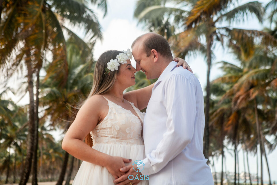 Com decoração de casamento pé na areia eles escolheram um dos cenários lindo do Nordeste para azer o ensaio gestante e sua renovação de votos