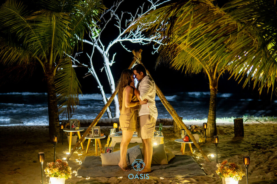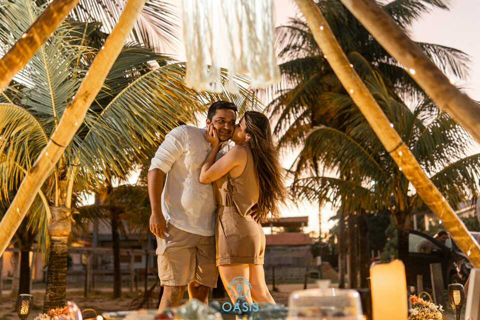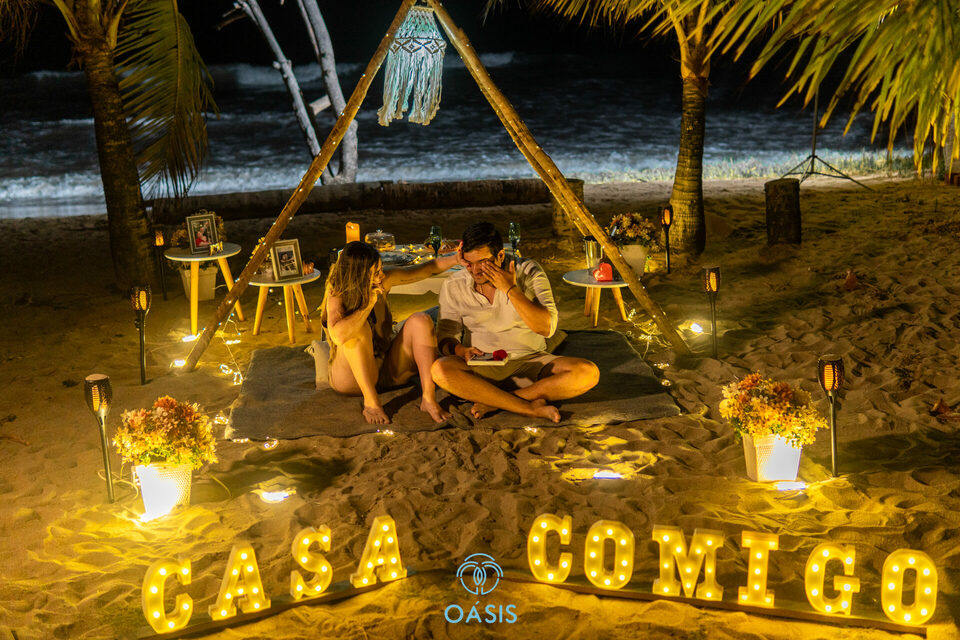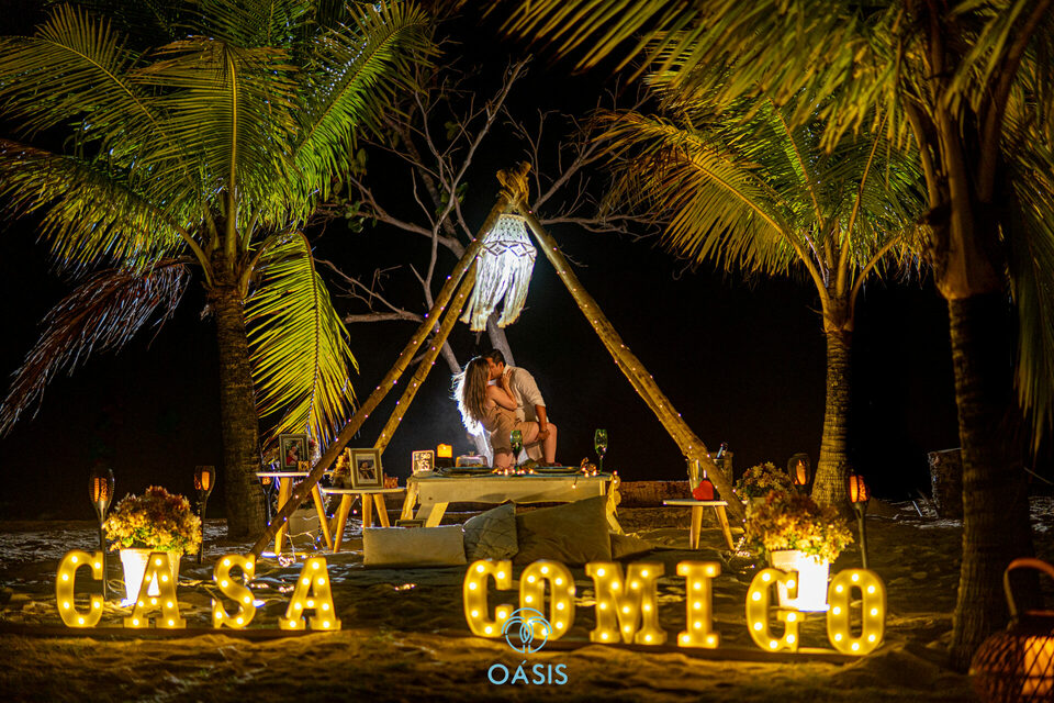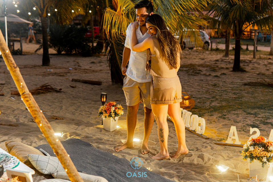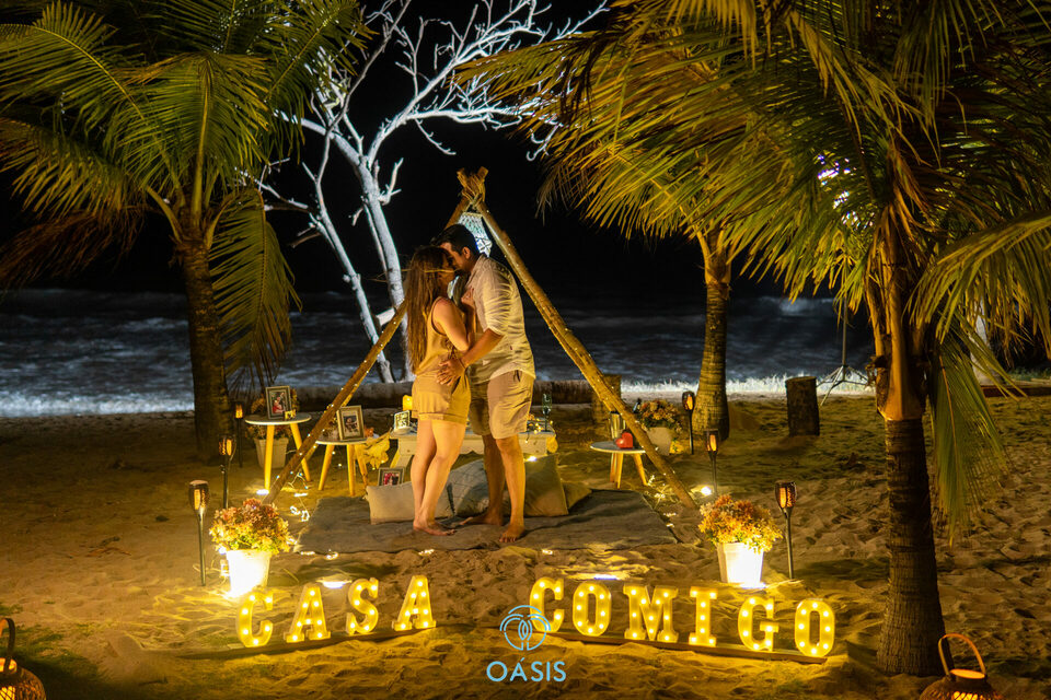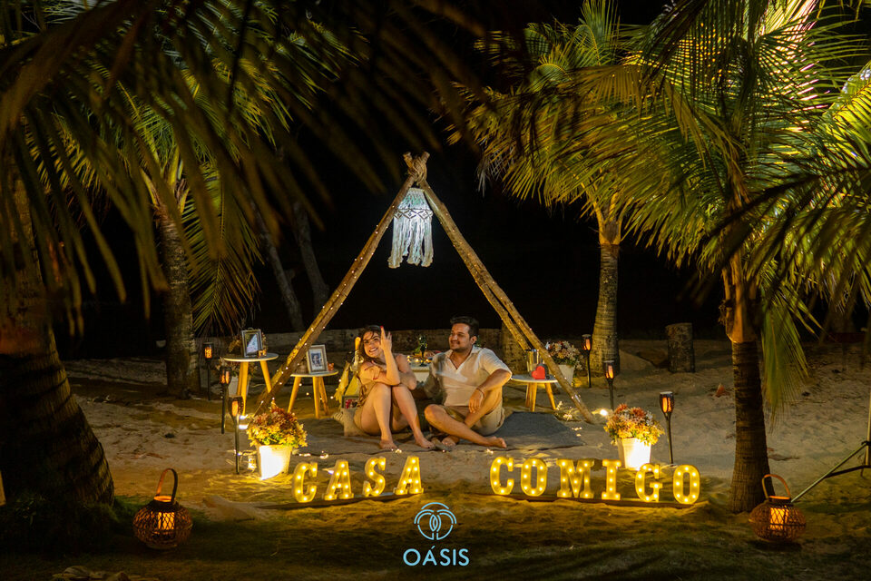 Um pedido de noivado no Caribe brasileiro com fotos maravilhosas, com a decoração entre os coqueiros com luzes de velas e uma musiquinha romântica