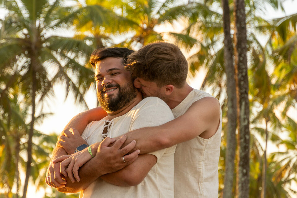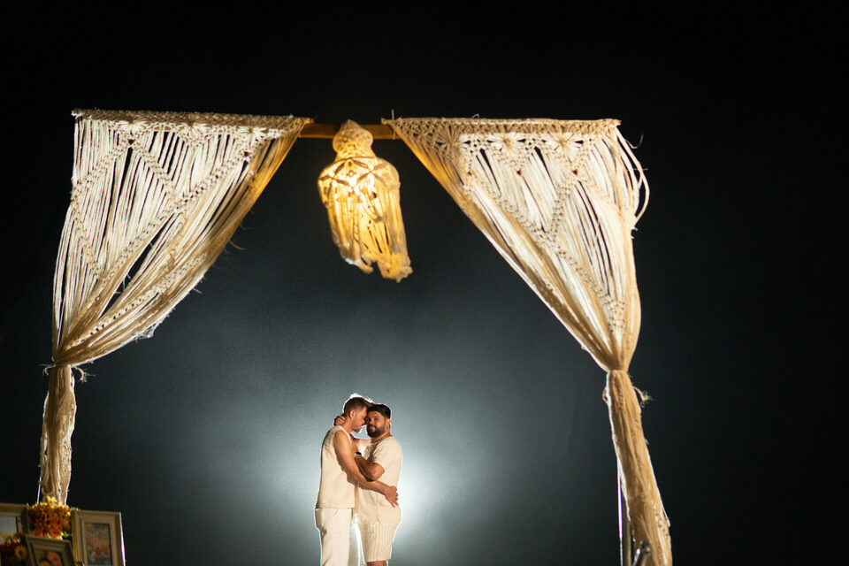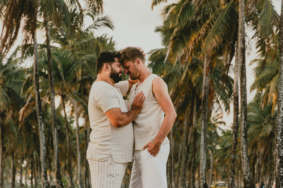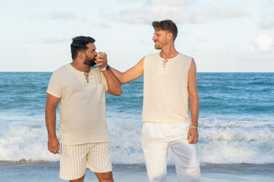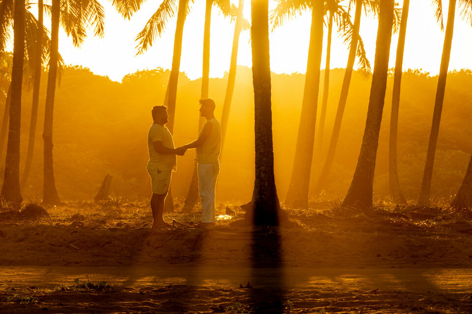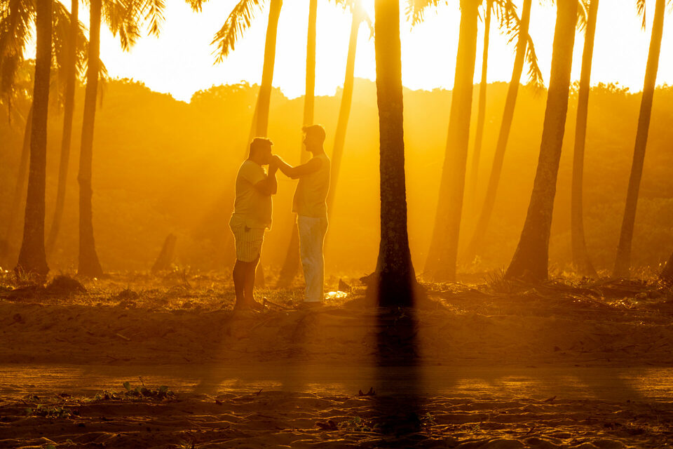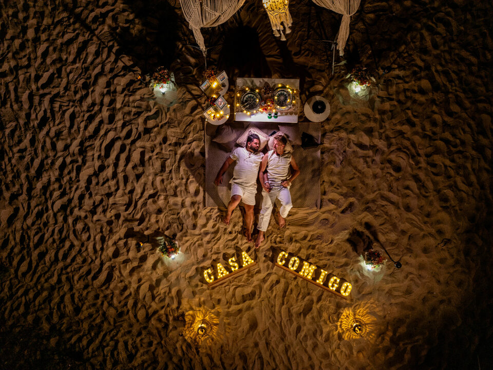 Um ensaio homoafetivo de dois homens encantadores com decoração, fotos, espumante, frios e um por do sol massa