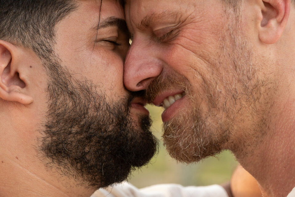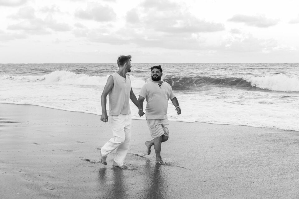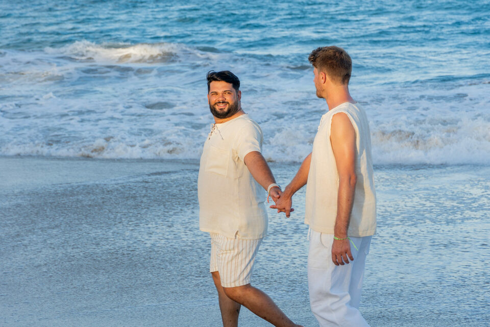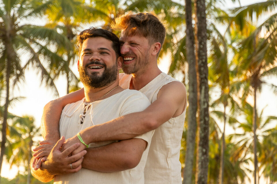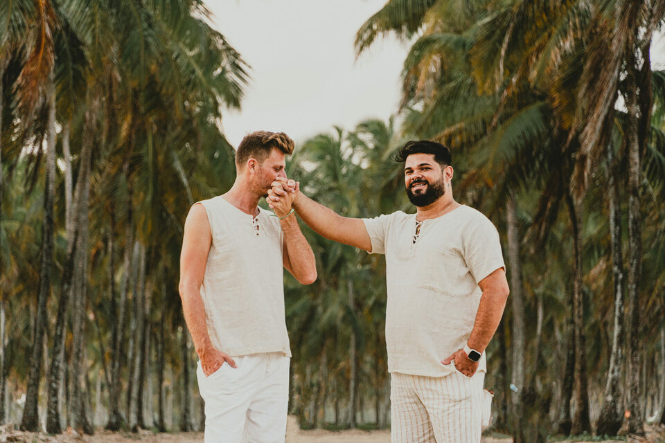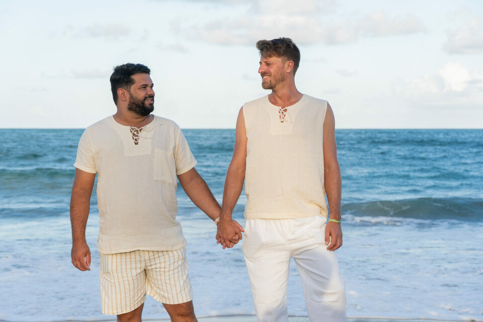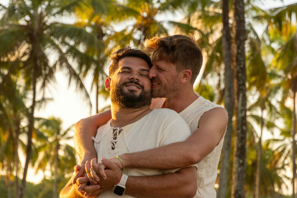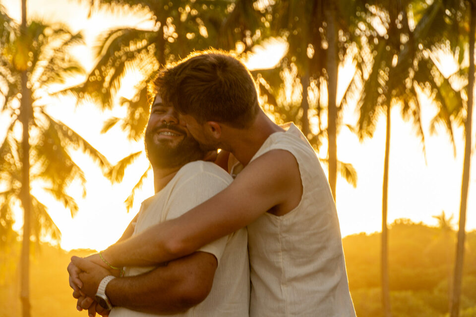 Um ensaio homoafetivo de dois homens encantadores com decoração, fotos, espumante, frios e um por do sol massa