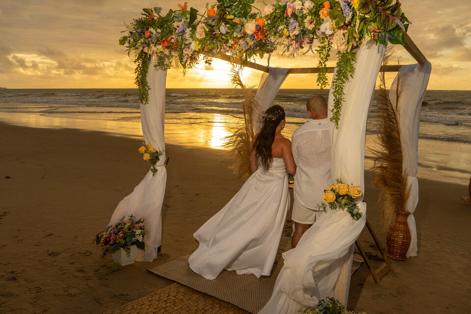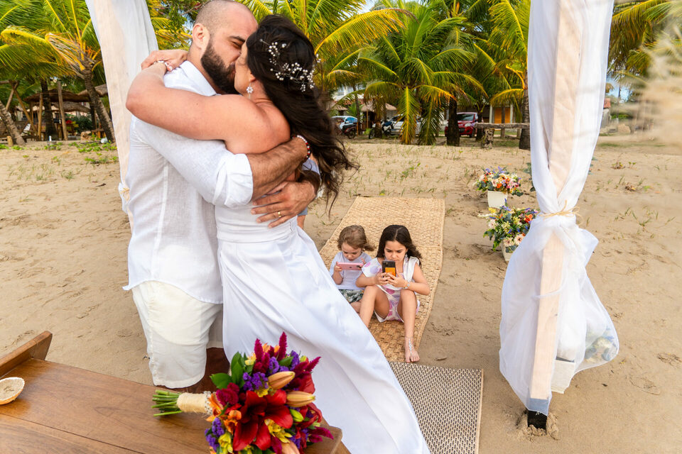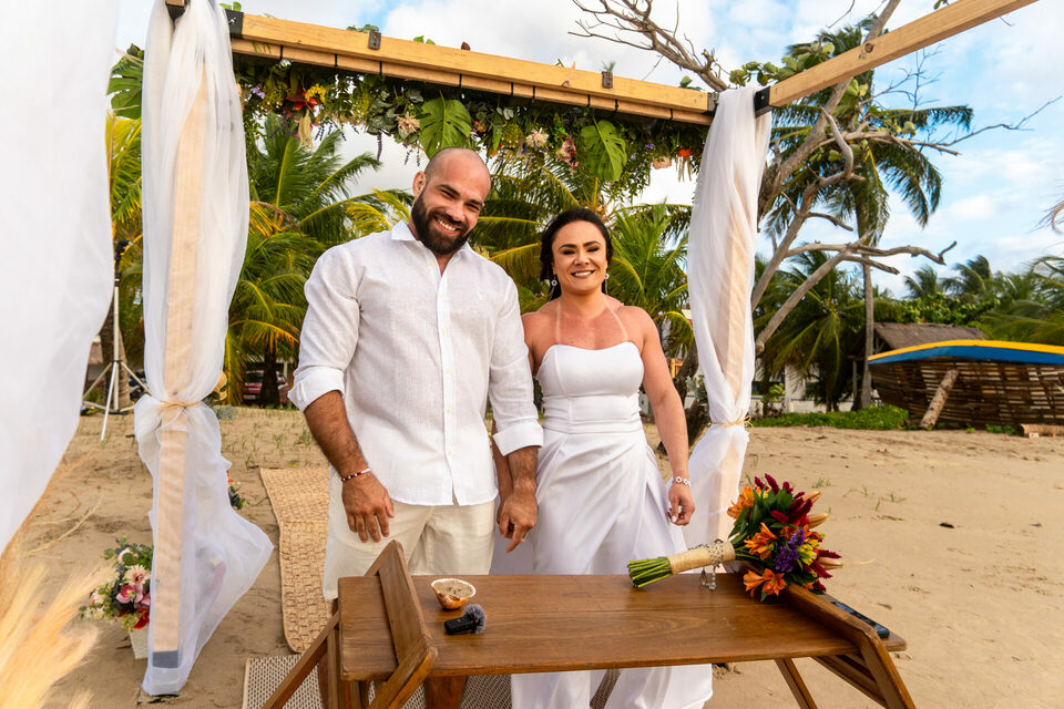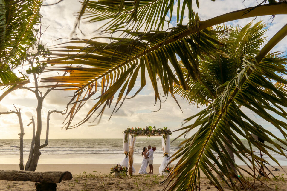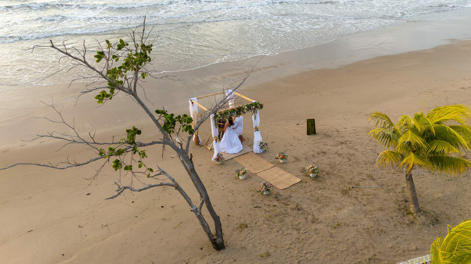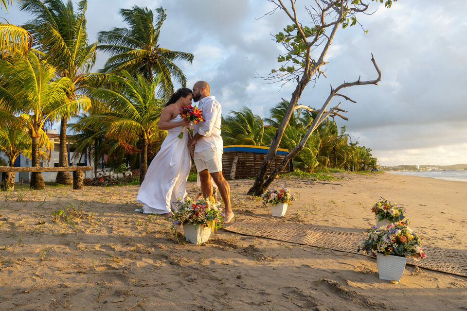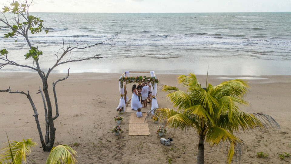 Um casamento intimista a dois pé na areia no Caribe brasileiro cocm nosso pacote incluindo cenário, fotos, vídeo, celebrante, drone, músico ao lado do