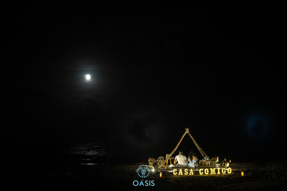 Uma decoração, fotos maravilhosas, praia linda, por do sol show, um brinde e uns frios para fechar esse pedido de casamento sensacional